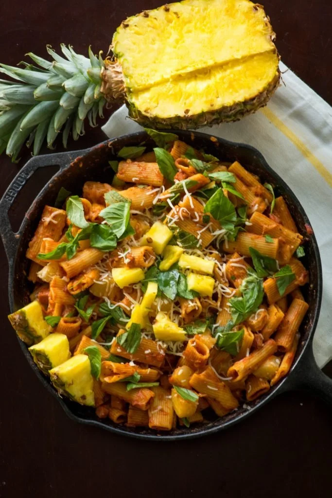 Rotini pasta, Pineapple chunks, garnished with grated parm, in a red sauce. - COMING SOON