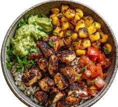 Cilantro Lime Rice, chipotle chicken, corn, blk beans, pico & mozzarella cheese.